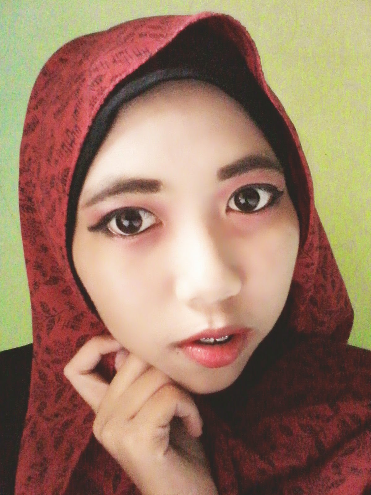 I imagine how is vampire's appearance in movies. Of course with the pale face (i gave much foundation), dark fringe eyes (eyeliner exactly!), little touch of red around the eyes, and i gave red lipstick to make sexy impression. For the hijab, i choose red hijab to get a 'sexy and elegant' vampire and i wore it with the simple style.
